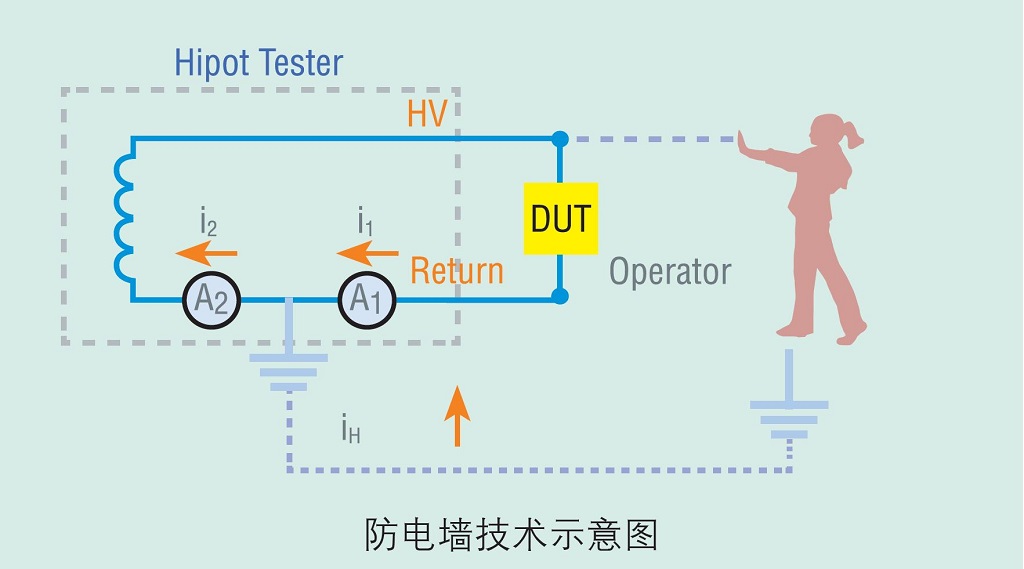 常州致新ZX9501系列耐壓機具有GFI防電墻功能來保護測試人員(原理如圖所示)。在突發(fā)人體感電的情形下,GFI能立即切斷儀器的電壓輸出,保護操作員不受電氣傷害。GFI功能偵測從地端(Earth GND)流回的電流iH與低端電流iL,比較后若大于0.5mA,則會立即切斷高壓輸出。